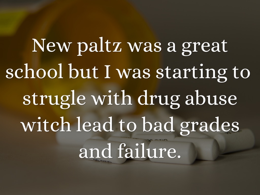 New paltz was a great school but I was starting to strugle with drug abuse witch lead to bad grades and failure.
