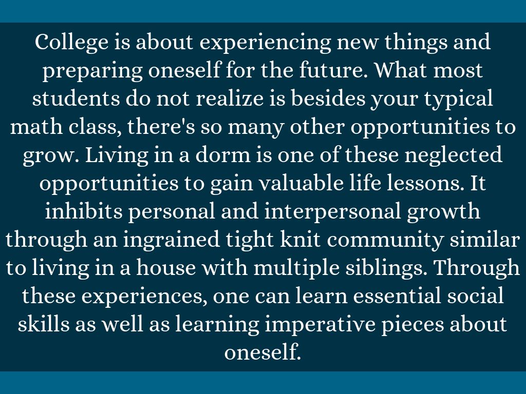 College is about experiencing new things and preparing oneself for the future. What most students do not realize is besides your typical math class, there's so many other opportunities to grow. Living in a dorm is one of these neglected opportunities to gain valuable life lessons. It inhibits personal and interpersonal growth through an ingrained tight knit community similar to living in a house with multiple siblings. Through these experiences, one can learn essential social skills as well as learning imperative pieces about oneself.