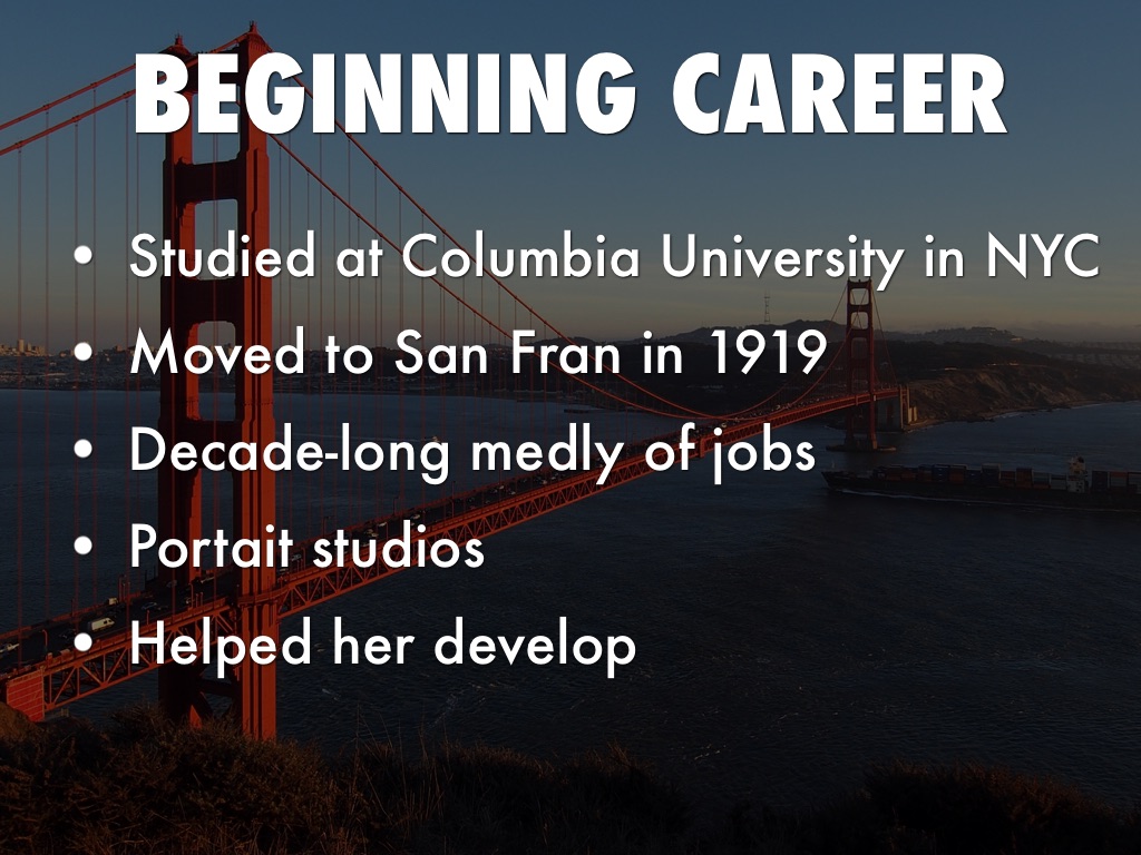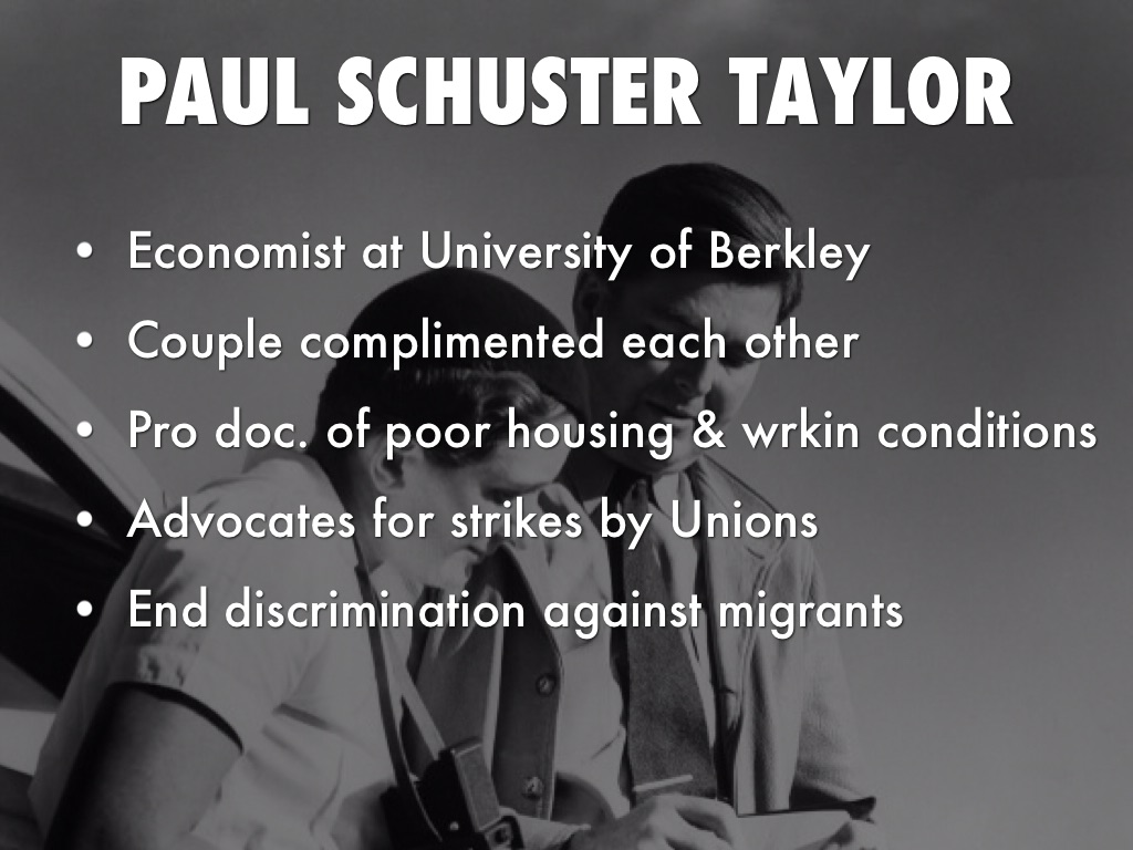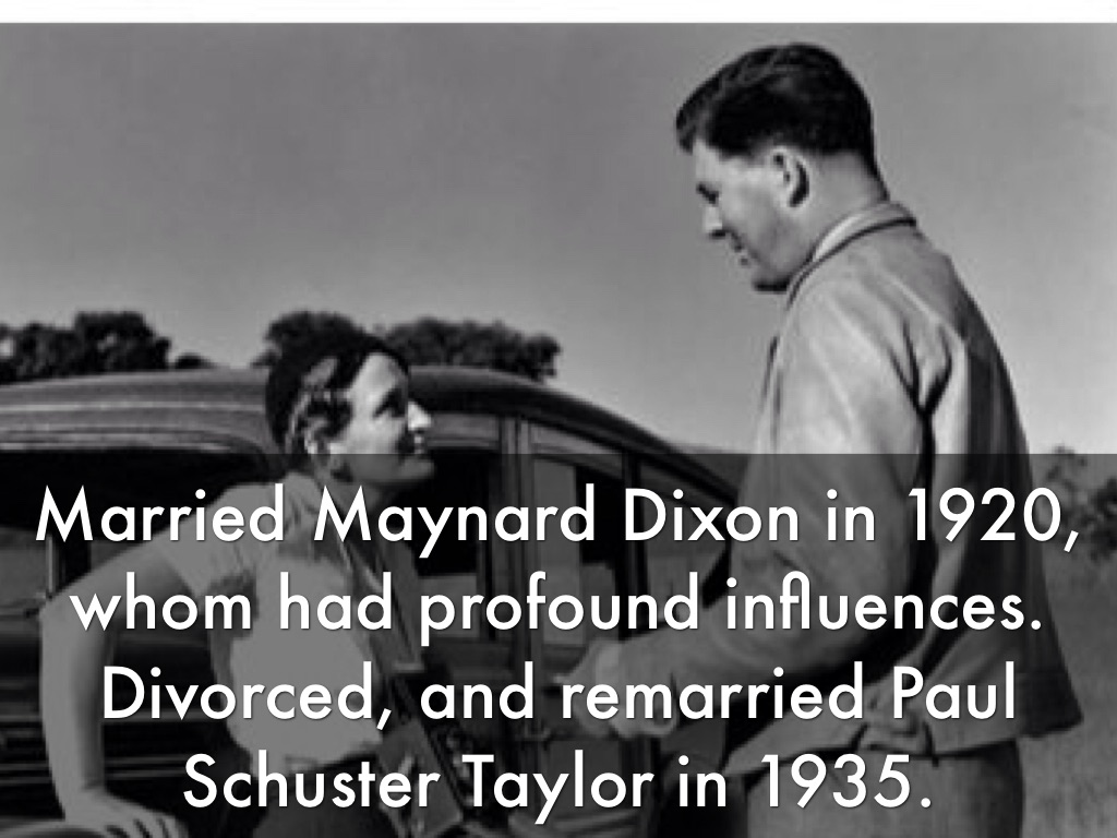 Married Maynard Dixon in 1920, whom had profound influences. Divorced, and remarried Paul Schuster Taylor in 1935.
