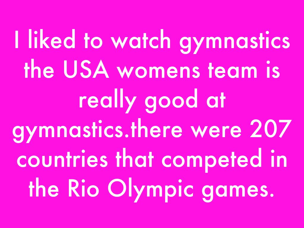 I liked to watch gymnastics the USA womens team is really good at gymnastics.there were 207 countries that competed in the Rio Olympic games.