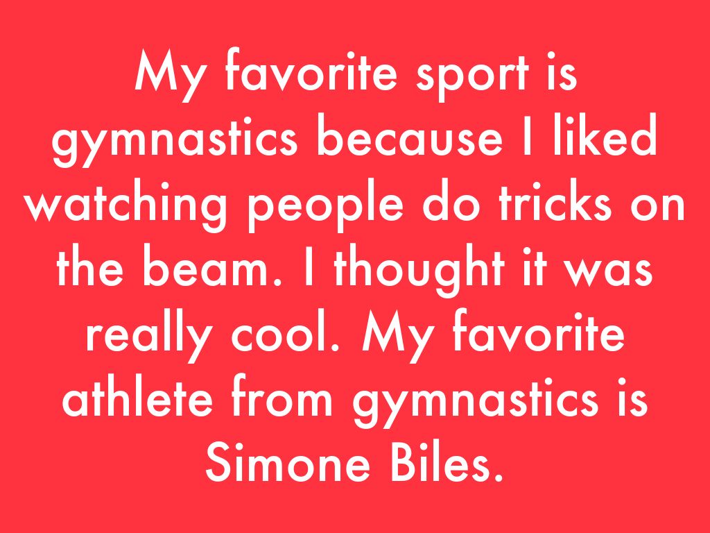 My favorite sport is gymnastics because I liked watching people do tricks on the beam. I thought it was really cool. My favorite athlete from gymnastics is Simone Biles.