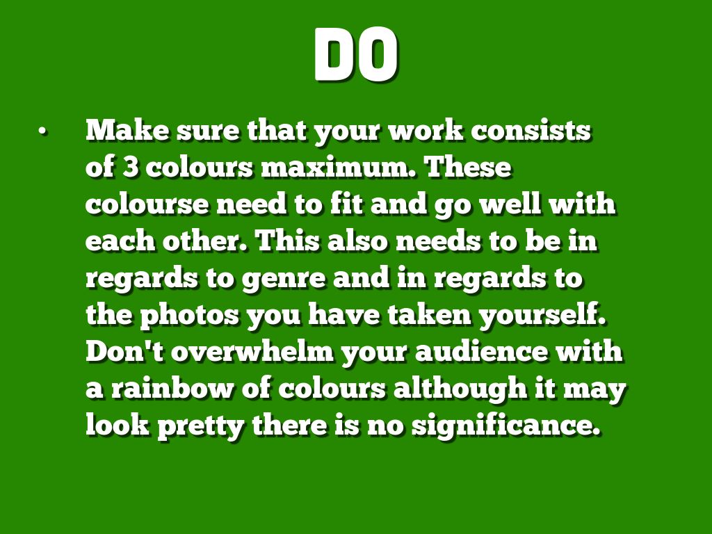 • Make sure that your work consists of 3 colours maximum. These colourse need to fit and go well with each other. This also needs to be in regards to genre and in regards to the photos you have taken yourself. Don't overwhelm your audience with a rainbow of colours although it may look pretty there is no significance.