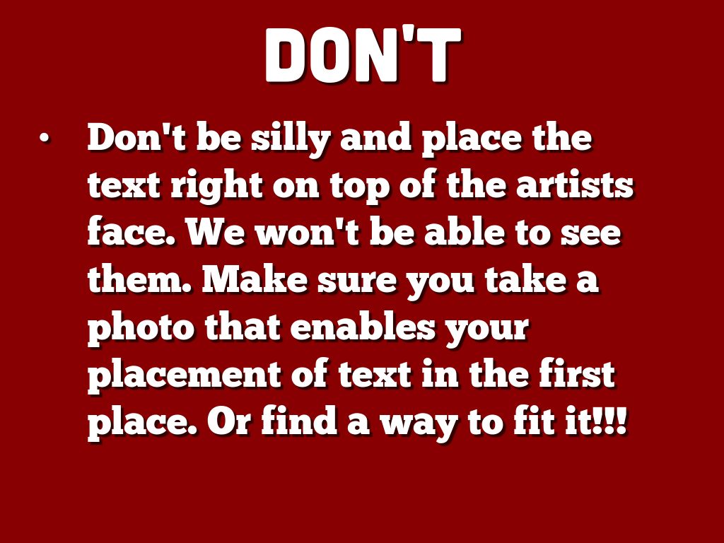 • Don't be silly and place the text right on top of the artists face. We won't be able to see them. Make sure you take a photo that enables your placement of text in the first place. Or find a way to fit it!!!