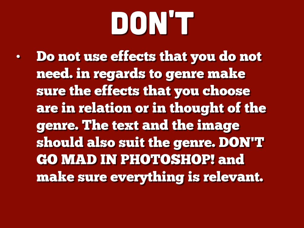 • Do not use effects that you do not need. in regards to genre make sure the effects that you choose are in relation or in thought of the genre. The text and the image should also suit the genre. DON'T GO MAD IN PHOTOSHOP! and make sure everything is relevant.
