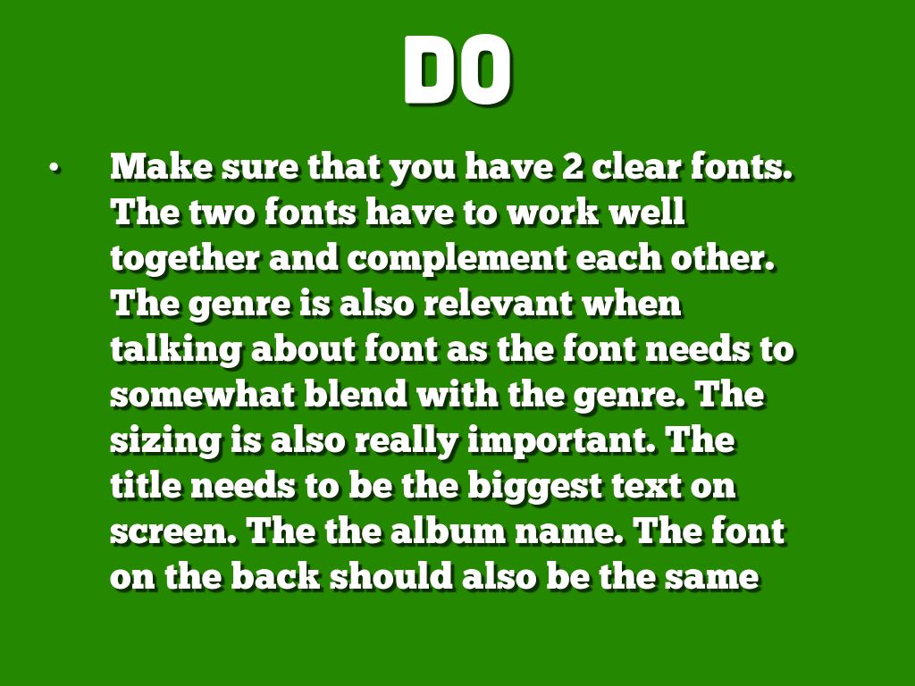 • Make sure that you have 2 clear fonts. The two fonts have to work well together and complement each other. The genre is also relevant when talking about font as the font needs to somewhat blend with the genre. The sizing is also really important. The title needs to be the biggest text on screen. The the album name. The font on the back should also be the same as the others and the font on the spine should be meduim sized.