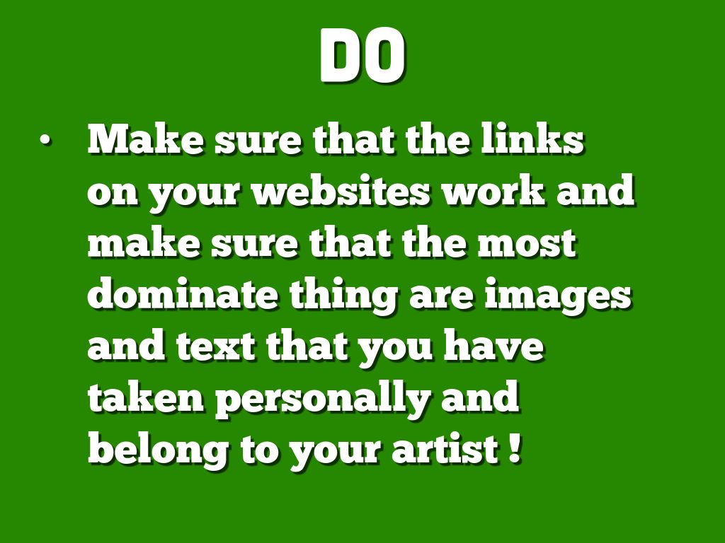 • Make sure that the links on your websites work and make sure that the most dominate thing are images and text that you have taken personally and belong to your artist !