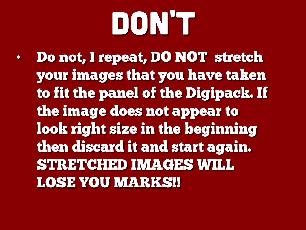 • Do not, I repeat, DO NOT stretch your images that you have taken to fit the panel of the Digipack. If the image does not appear to look right size in the beginning then discard it and start again. STRETCHED IMAGES WILL LOSE YOU MARKS!!