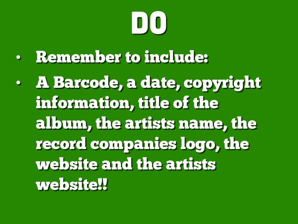 • A Barcode, a date, copyright information, title of the album, the artists name, the record companies logo, the website and the artists website!!