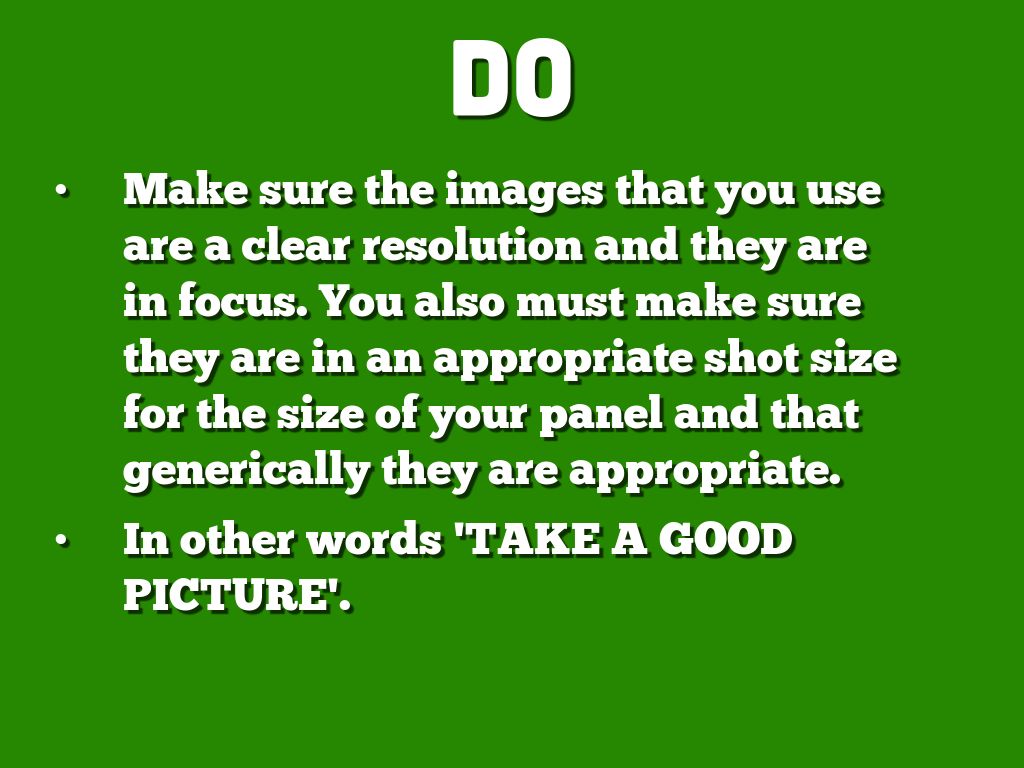 • Make sure the images that you use are a clear resolution and they are in focus. You also must make sure they are in an appropriate shot size for the size of your panel and that generically they are appropriate.