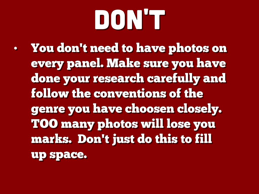 • You don't need to have photos on every panel. Make sure you have done your research carefully and follow the conventions of the genre you have choosen closely. TOO many photos will lose you marks. Don't just do this to fill up space.