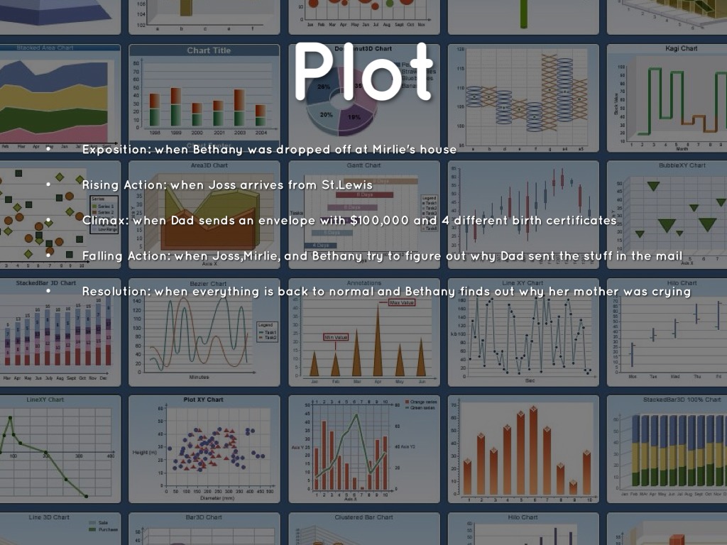 Falling Action: when Joss,Mirlie, and Bethany try to figure out why Dad sent the stuff in the mail
