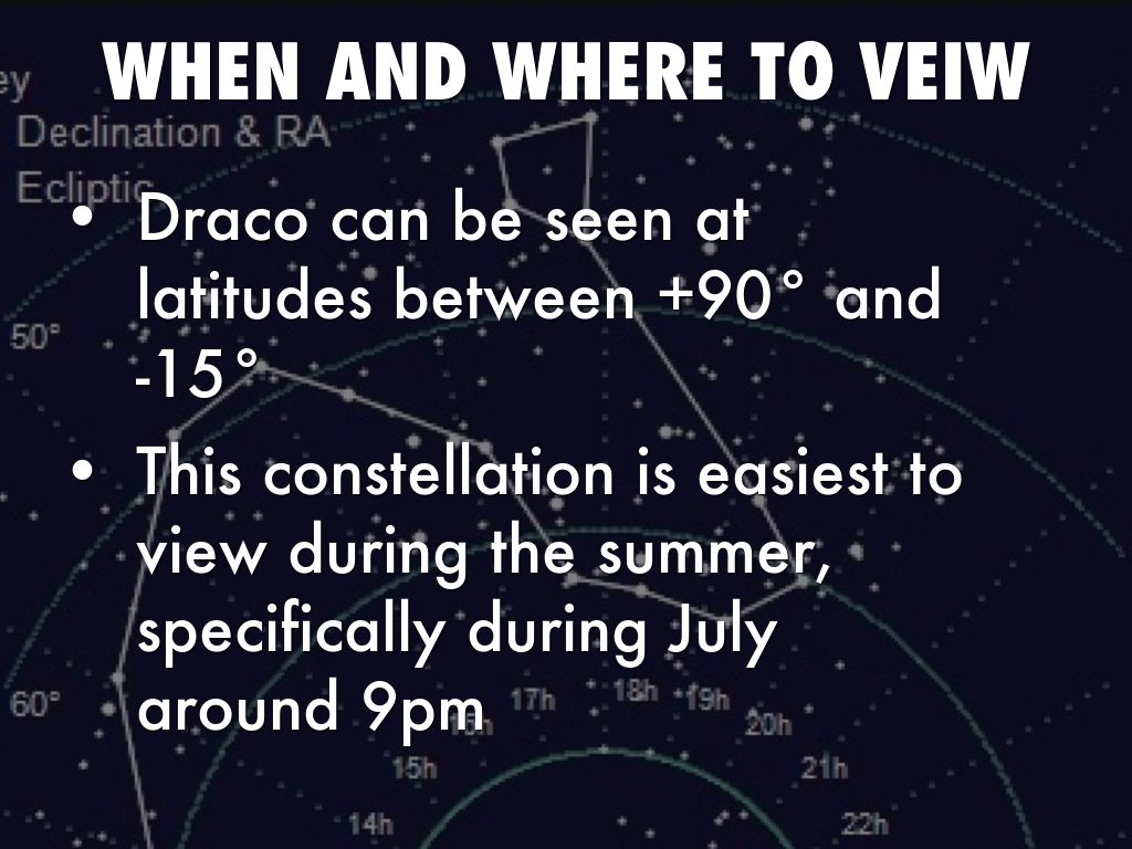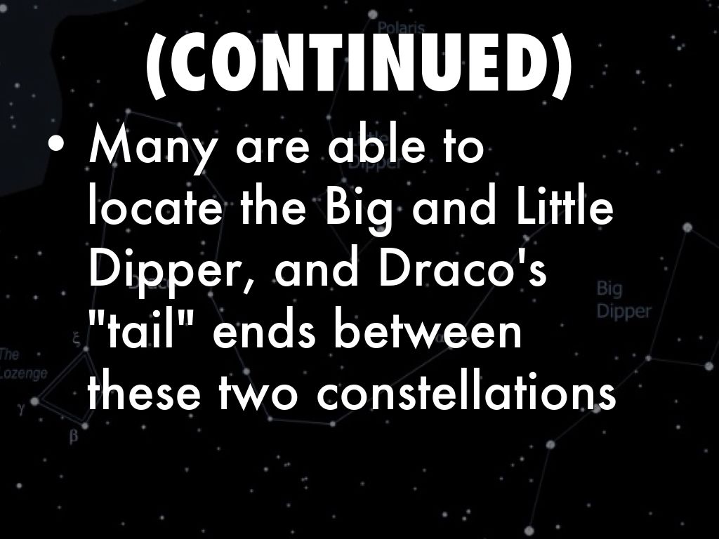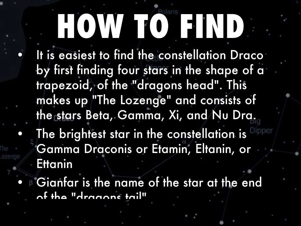 It is easiest to find the constellation Draco by first finding four stars in the shape of a trapezoid, of the "dragons head". This makes up "The Lozenge" and consists of the stars Beta, Gamma, Xi, and Nu Dra.
