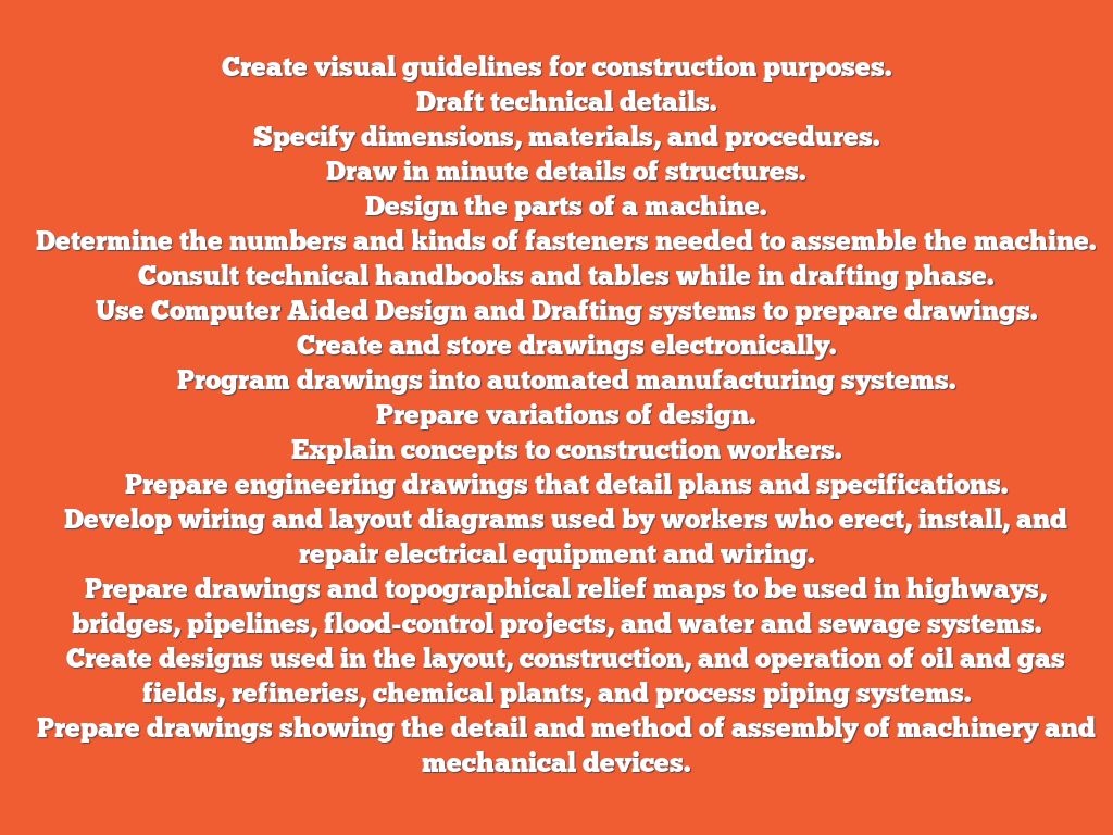 Use Computer Aided Design and Drafting systems to prepare drawings.