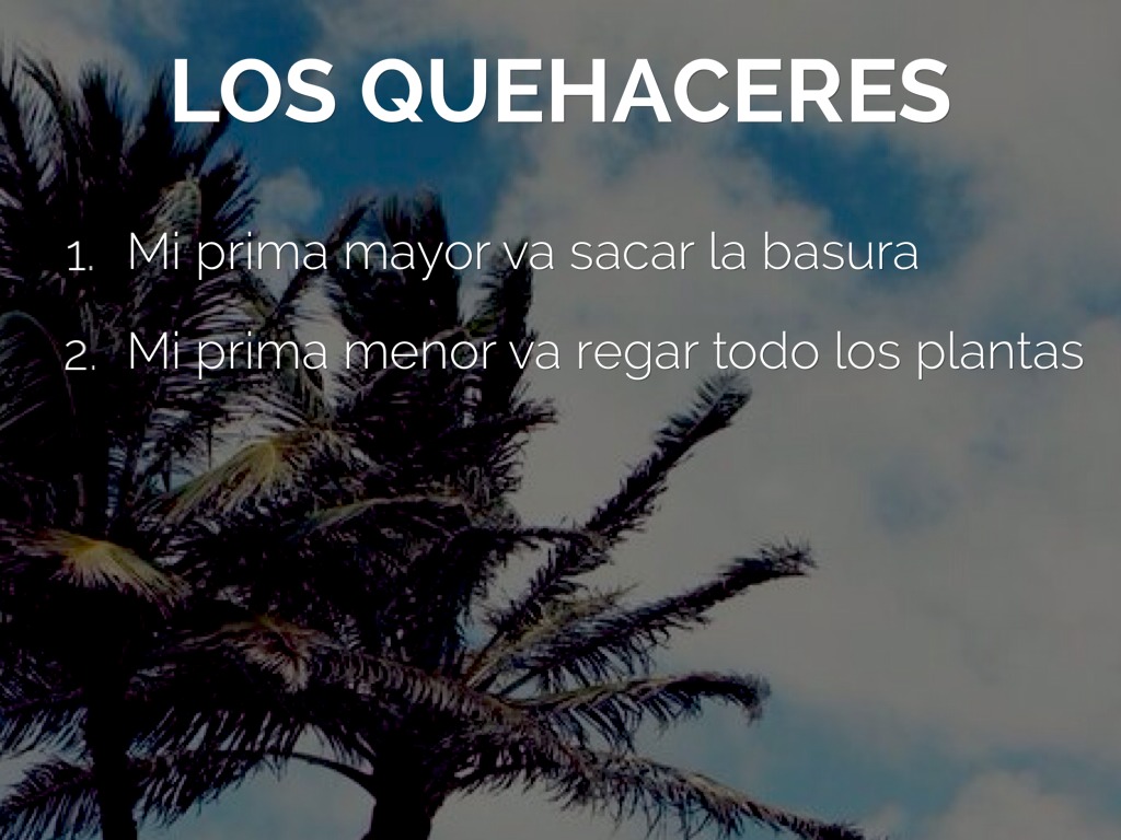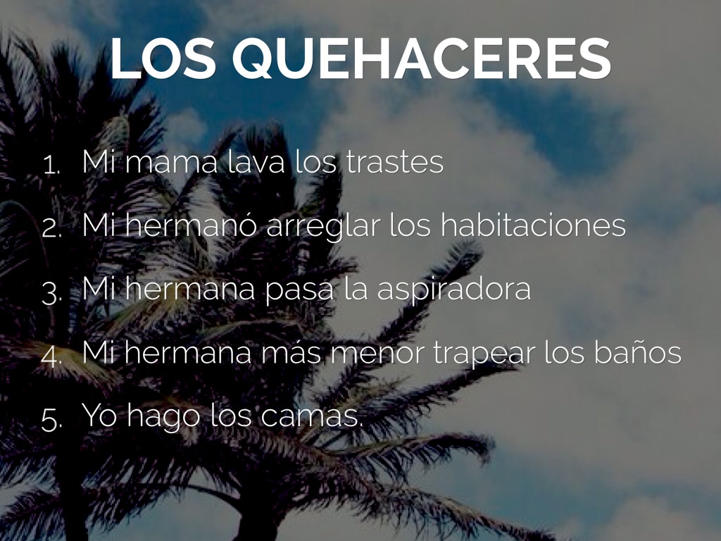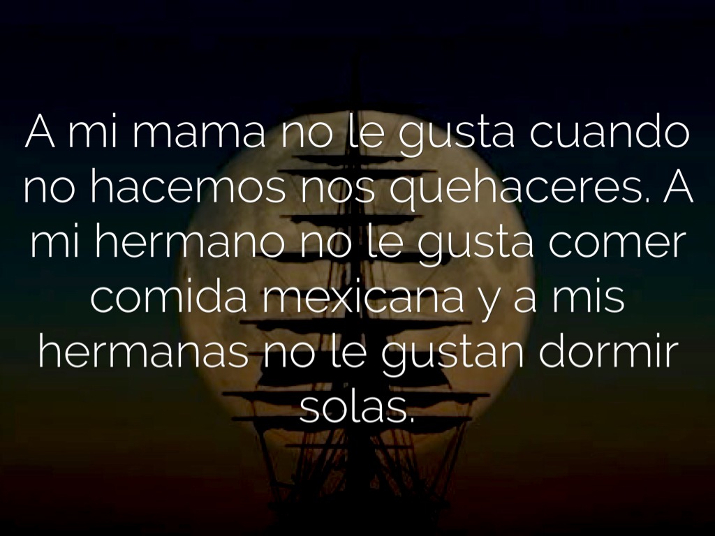 A mi mama no le gusta cuando no hacemos nos quehaceres. A mi hermano no le gusta comer comida mexicana y a mis hermanas no le gustan dormir solas.