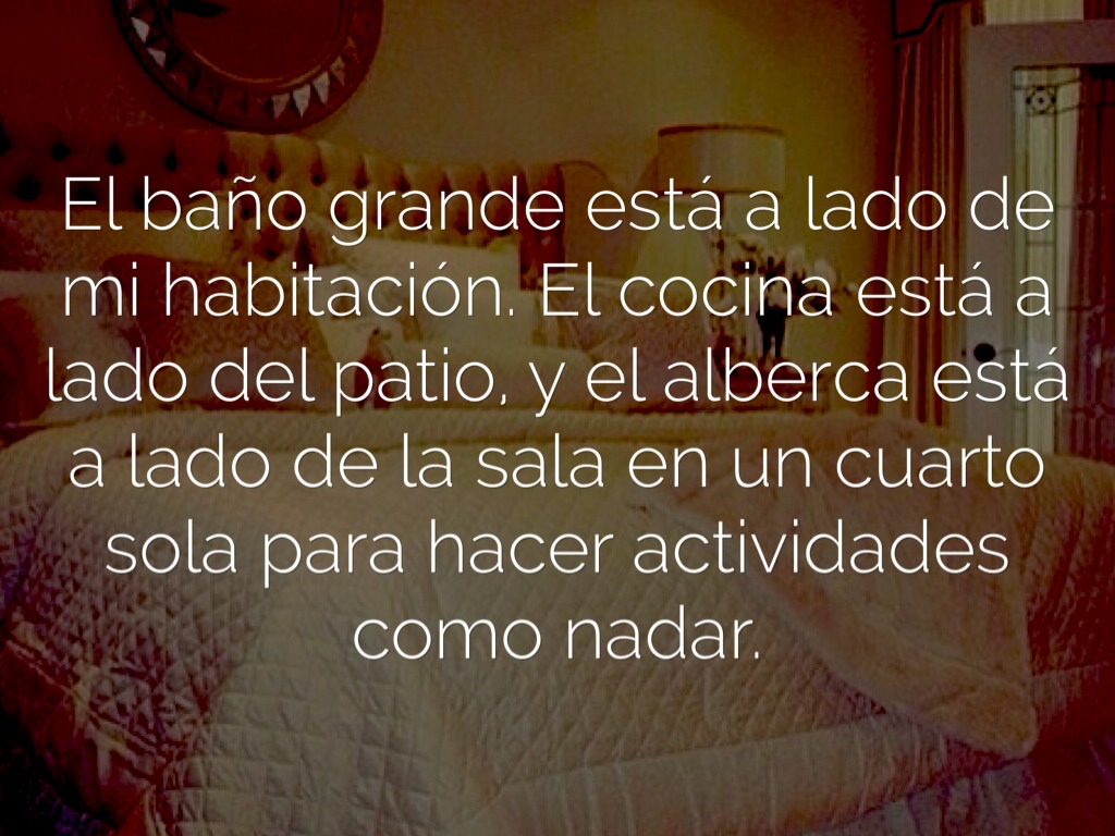 El baño grande está a lado de mi habitación. El cocina está a lado del patio, y el alberca está a lado de la sala en un cuarto sola para hacer actividades como nadar.
