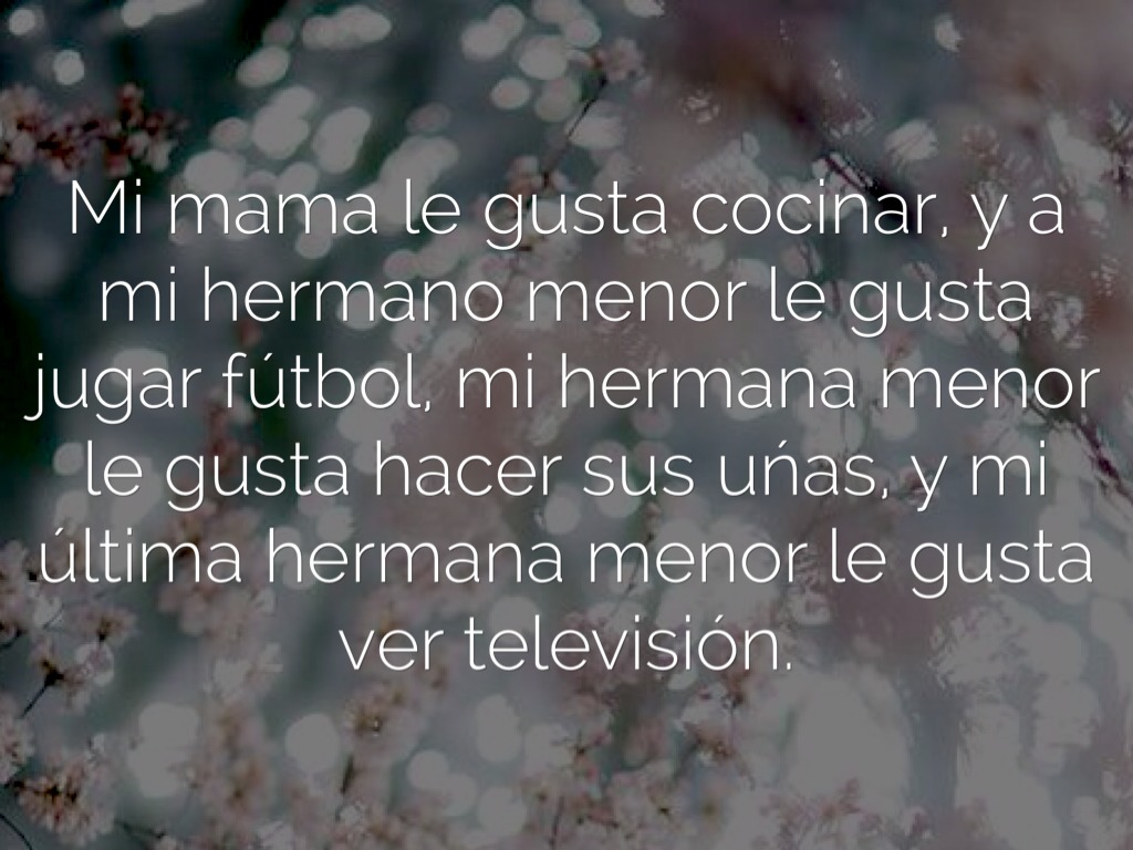 Mi mama le gusta cocinar, y a mi hermano menor le gusta jugar fútbol, mi hermana menor le gusta hacer sus uńas, y mi última hermana menor le gusta ver televisión.