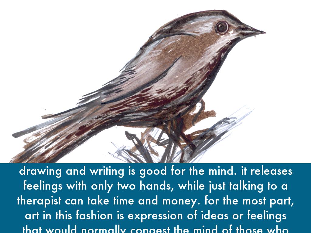 drawing and writing is good for the mind. it releases feelings with only two hands, while just talking to a therapist can take time and money. for the most part, art in this fashion is expression of ideas or feelings that would normally congest the mind of those who don't dream of putting it to good use.