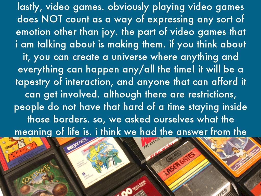 lastly, video games. obviously playing video games does NOT count as a way of expressing any sort of emotion other than joy. the part of video games that i am talking about is making them. if you think about it, you can create a universe where anything and everything can happen any/all the time! it will be a tapestry of interaction, and anyone that can afford it can get involved. although there are restrictions, people do not have that hard of a time staying inside those borders. so, we asked ourselves what the meaning of life is. i think we had the answer from the start. my theory is; the meaning of life is being the best you can, and pave the path for the others who wish to do the same.