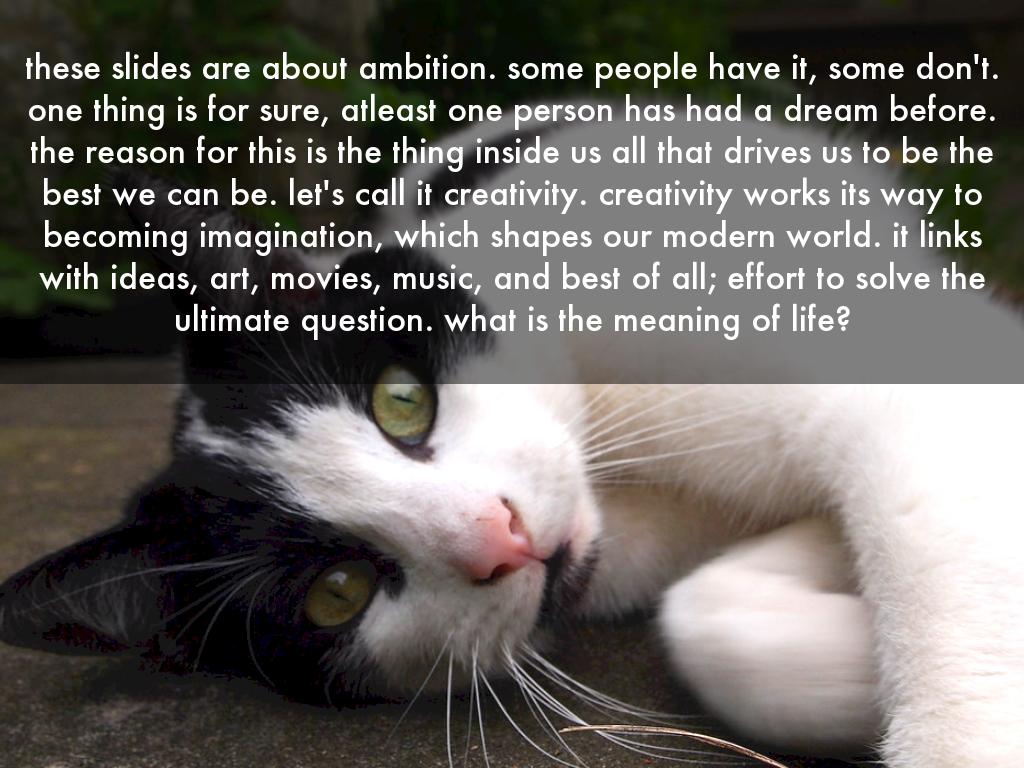 these slides are about ambition. some people have it, some don't. one thing is for sure, atleast one person has had a dream before. the reason for this is the thing inside us all that drives us to be the best we can be. let's call it creativity. creativity works its way to becoming imagination, which shapes our modern world. it links with ideas, art, movies, music, and best of all; effort to solve the ultimate question. what is the meaning of life?