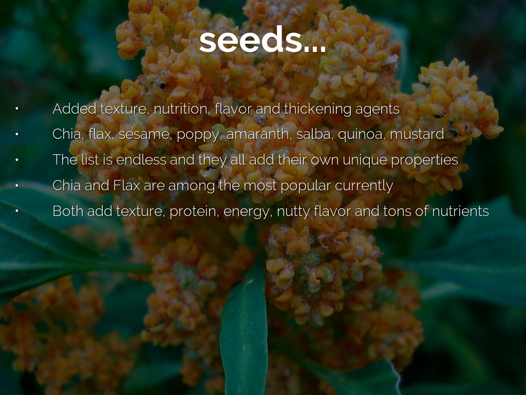 Chia, flax, sesame, poppy, amaranth, salba, quinoa, mustard