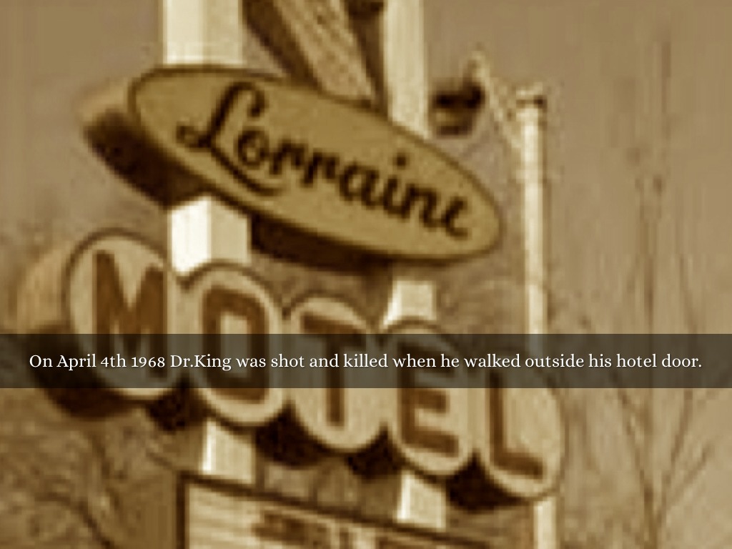 On April 4th 1968 Dr.King was shot and killed when he walked outside his hotel door.
