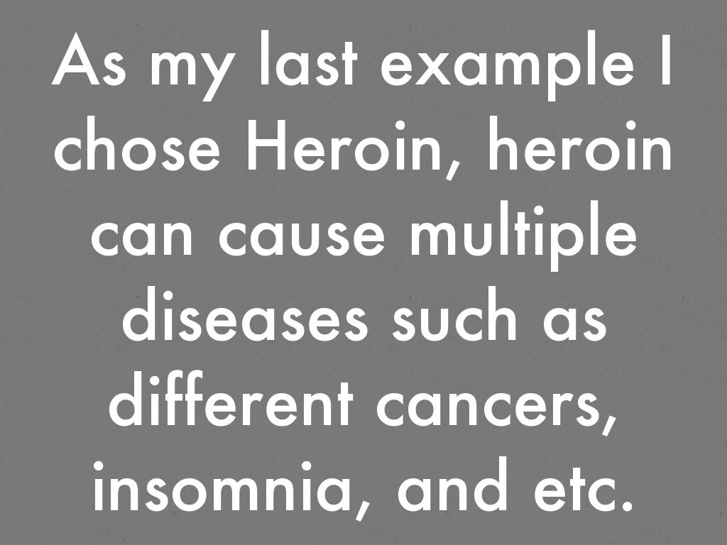 As my last example I chose Heroin, heroin can cause multiple diseases such as different cancers, insomnia, and etc.