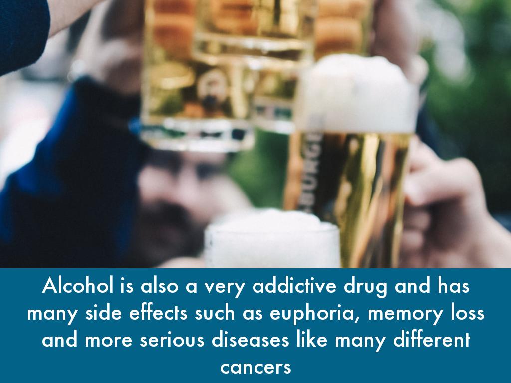 Alcohol is also a very addictive drug and has many side effects such as euphoria, memory loss and more serious diseases like many different cancers
