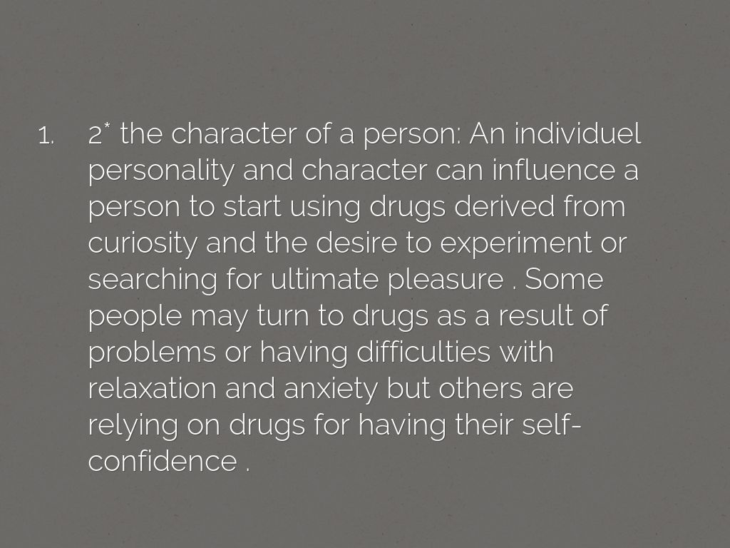 - 2* the character of a person: An individuel personality and character can influence a person to start using drugs derived from curiosity and the desire to experiment or searching for ultimate pleasure . Some people may turn to drugs as a result of problems or having difficulties with relaxation and anxiety but others are relying on drugs for having their self-confidence .