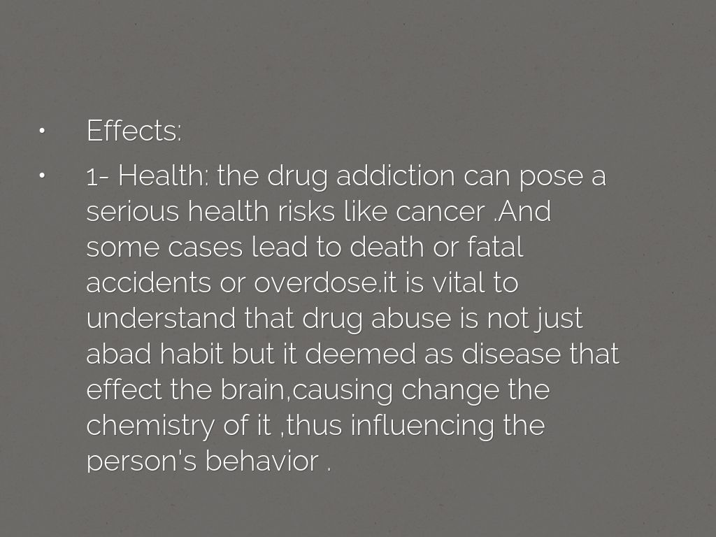 - 1- Health: the drug addiction can pose a serious health risks like cancer .And some cases lead to death or fatal accidents or overdose.it is vital to understand that drug abuse is not just abad habit but it deemed as disease that effect the brain,causing change the chemistry of it ,thus influencing the person's behavior .
