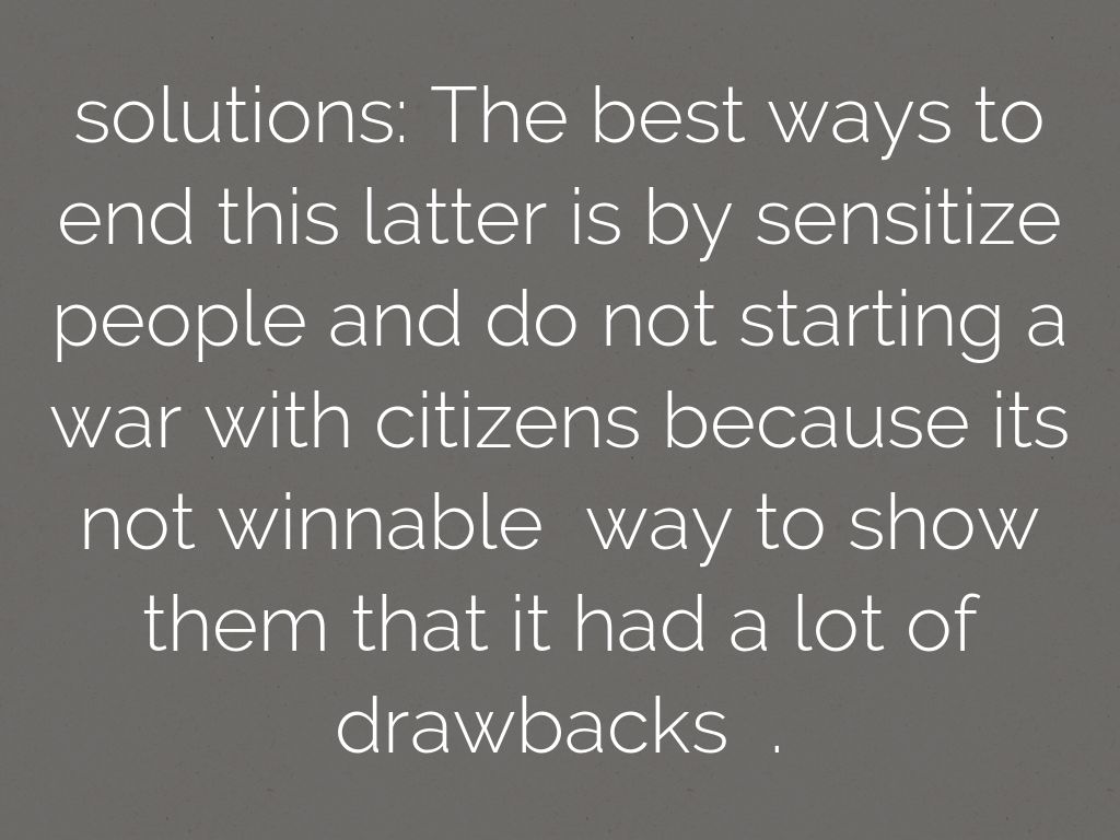 solutions: The best ways to end this latter is by sensitize people and do not starting a war with citizens because its not winnable way to show them that it had a lot of drawbacks .