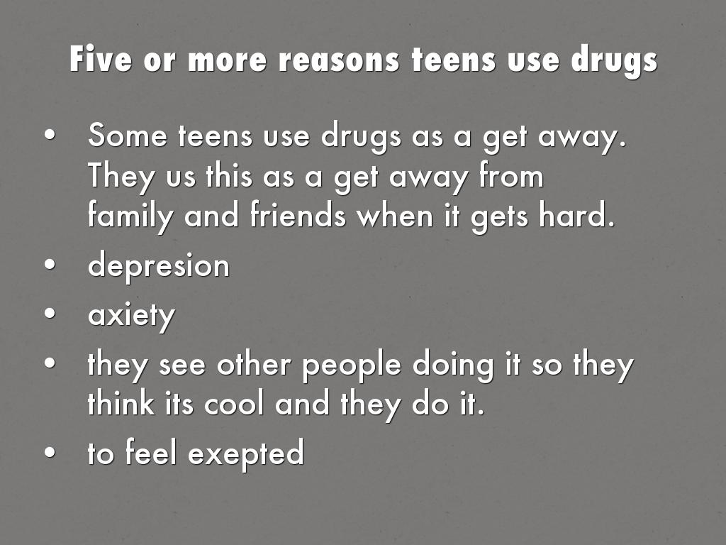 Some teens use drugs as a get away. They us this as a get away from family and friends when it gets hard.