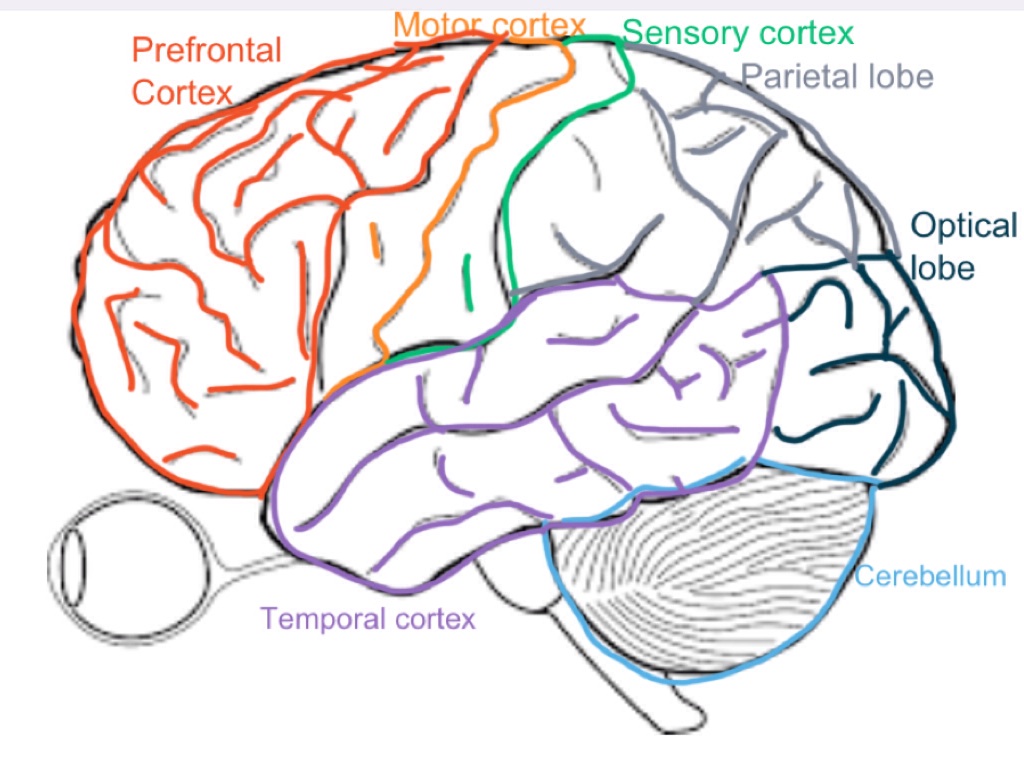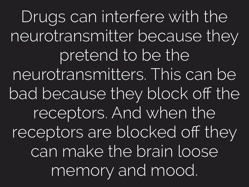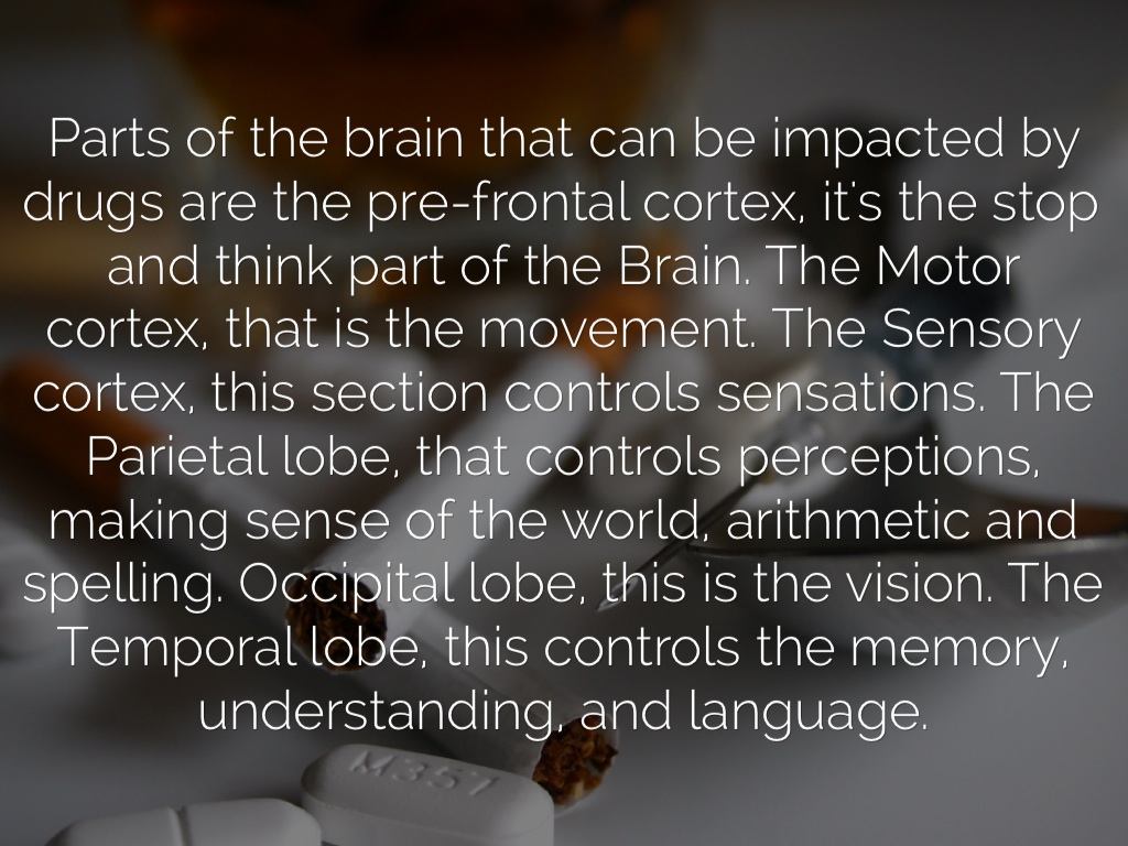 Parts of the brain that can be impacted by drugs are the pre-frontal cortex, it's the stop and think part of the Brain. The Motor cortex, that is the movement. The Sensory cortex, this section controls sensations. The Parietal lobe, that controls perceptions, making sense of the world, arithmetic and spelling. Occipital lobe, this is the vision. The Temporal lobe, this controls the memory, understanding, and language.