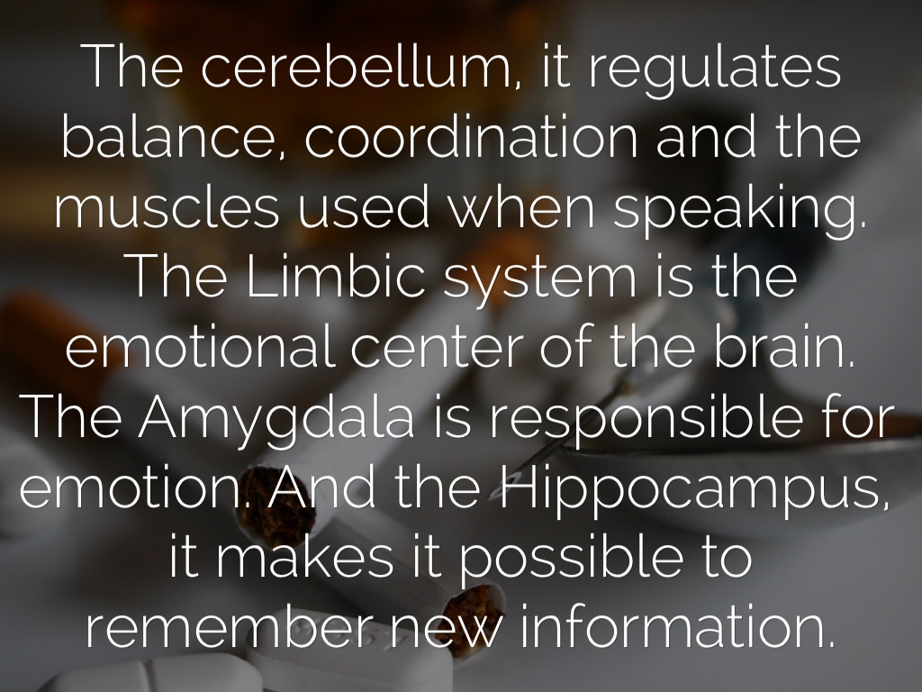The cerebellum, it regulates balance, coordination and the muscles used when speaking. The Limbic system is the emotional center of the brain. The Amygdala is responsible for emotion. And the Hippocampus, it makes it possible to remember new information.