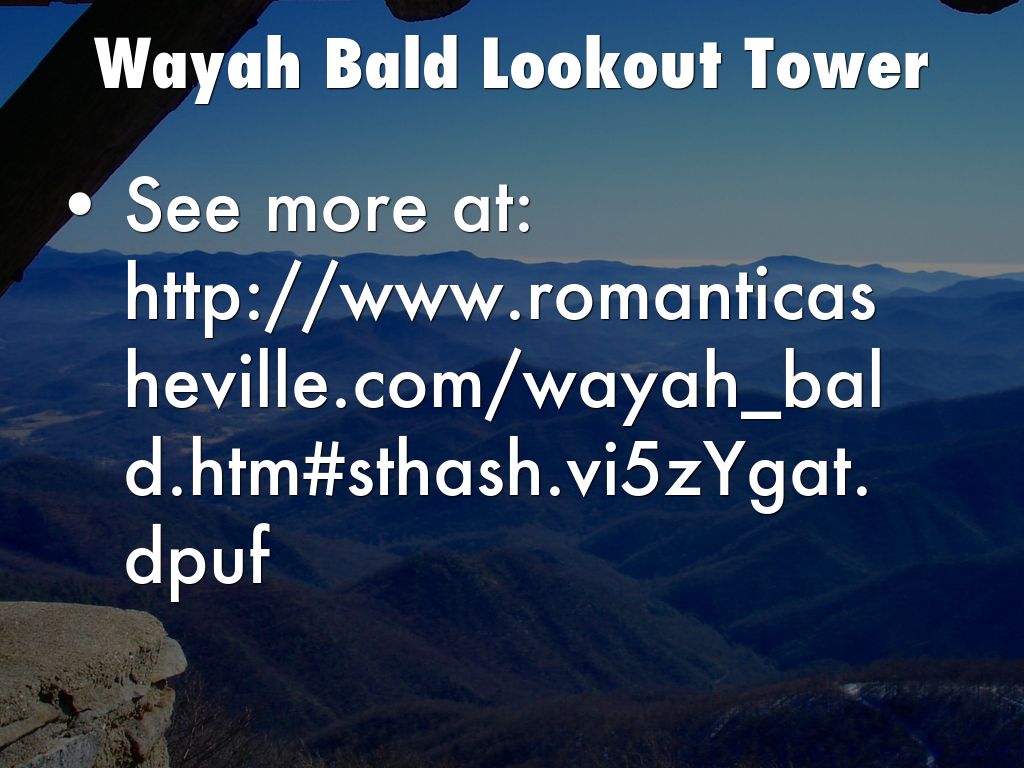 Wayah Bald has a vantage point 5,342 feet in elevation in the Nantahala National Forest, near Franklin, North Carolina. On a clear day, you can see north to the Great Smoky Mountains in Tennessee and south into the rolling hills of Georgia. - See more at: http://www.romanticasheville.com/wayah_bald.htm#sthash.vi5zYgat.dpuf