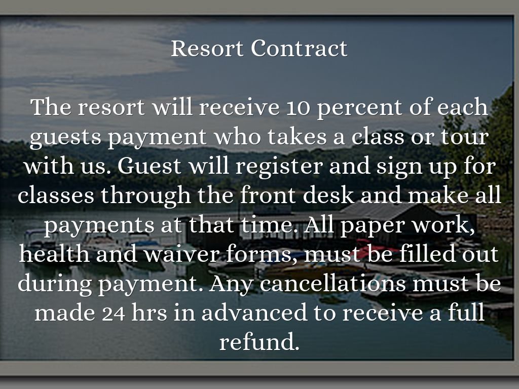 The resort will receive 10 percent of each guests payment who takes a class or tour with us. Guest will register and sign up for classes through the front desk and make all payments at that time. All paper work, health and waiver forms, must be filled out during payment. Any cancellations must be made 24 hrs in advanced to receive a full refund.