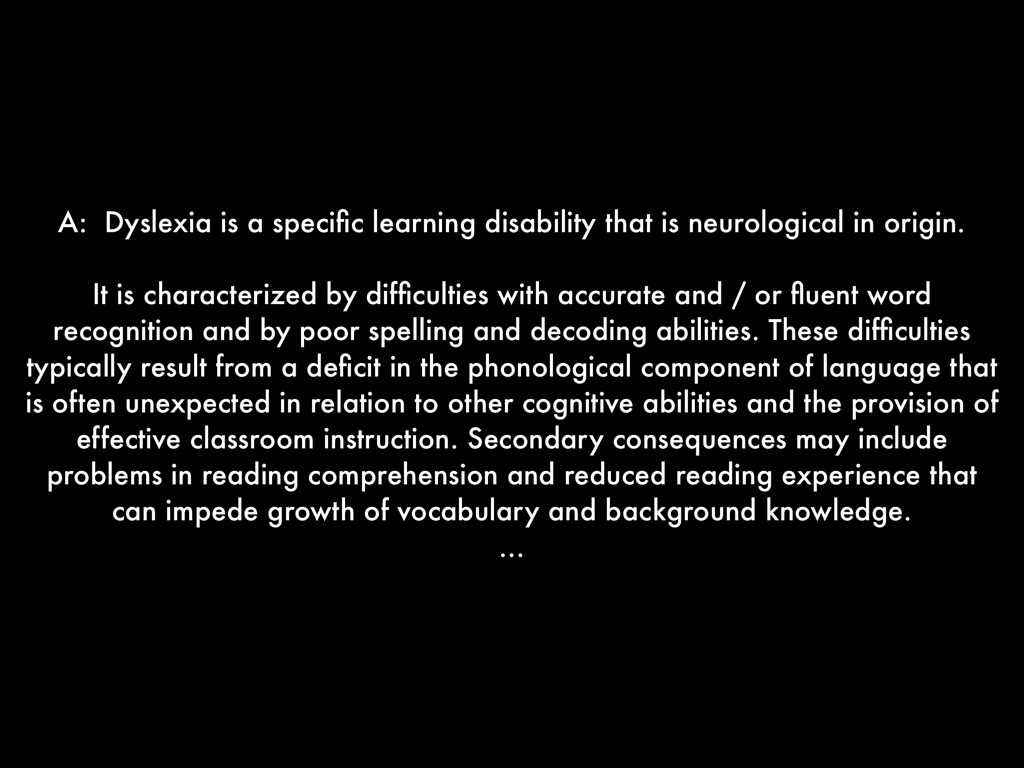 A: Dyslexia is a specific learning disability that is neurological in origin.