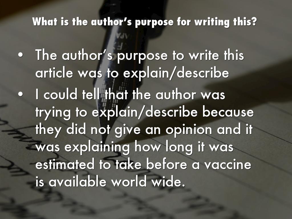 I could tell that the author was trying to explain/describe because they did not give an opinion and it was explaining how long it was estimated to take before a vaccine is available world wide.