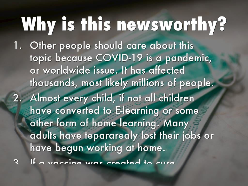 Other people should care about this topic because COVID-19 is a pandemic, or worldwide issue. It has affected thousands, most likely millions of people.