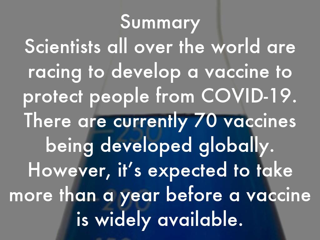 Summary Scientists all over the world are racing to develop a vaccine to protect people from COVID-19. There are currently 70 vaccines being developed globally. However, it’s expected to take more than a year before a vaccine is widely available.