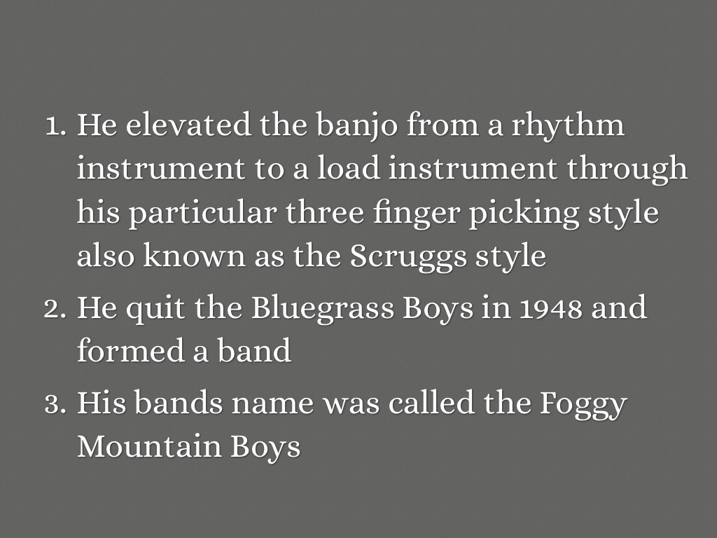 He elevated the banjo from a rhythm instrument to a load instrument through his particular three finger picking style also known as the Scruggs style