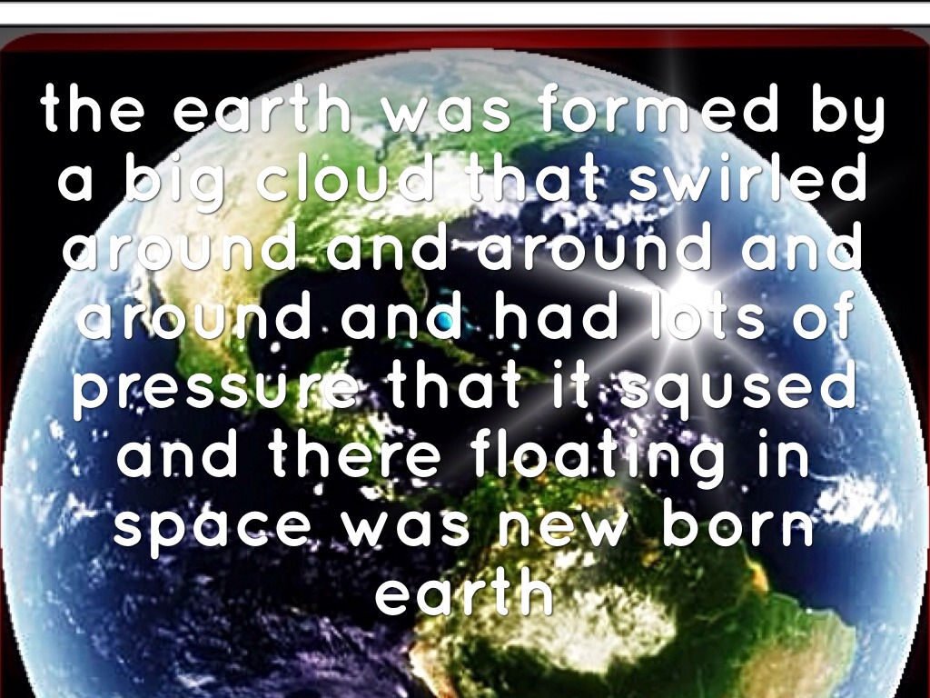 the earth was formed by a big cloud that swirled around and around and around and had lots of pressure that it sqused and there floating in space was new born earth