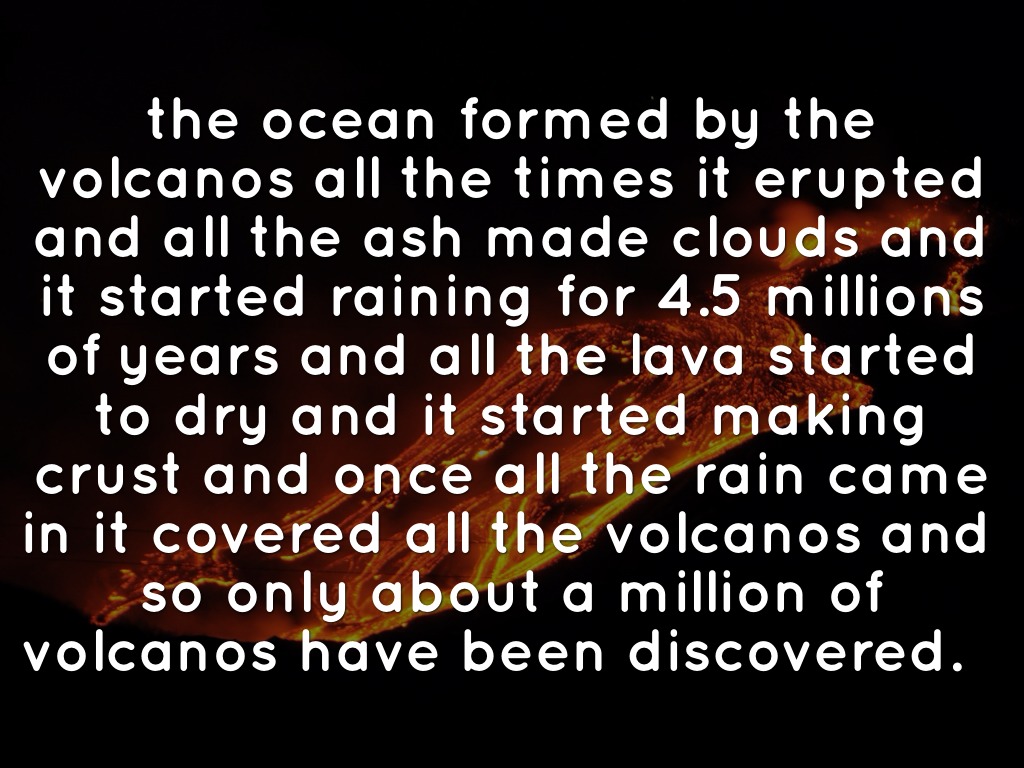 the ocean formed by the volcanos all the times it erupted and all the ash made clouds and it started raining for 4.5 millions of years and all the lava started to dry and it started making crust and once all the rain came in it covered all the volcanos and so only about a million of volcanos have been discovered.