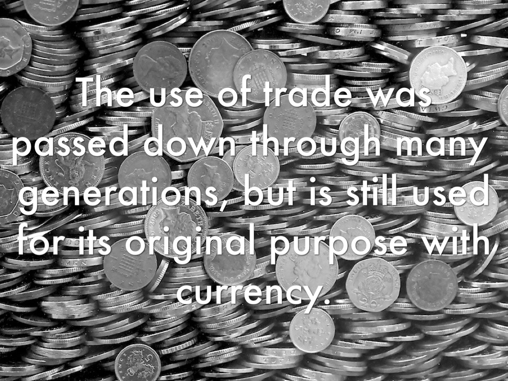The use of trade was passed down through many generations, but is still used for its original purpose with currency.