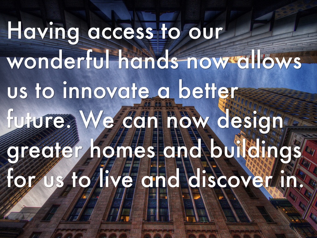 Having access to our wonderful hands now allows us to innovate a better future. We can now design greater homes and buildings for us to live and discover in.