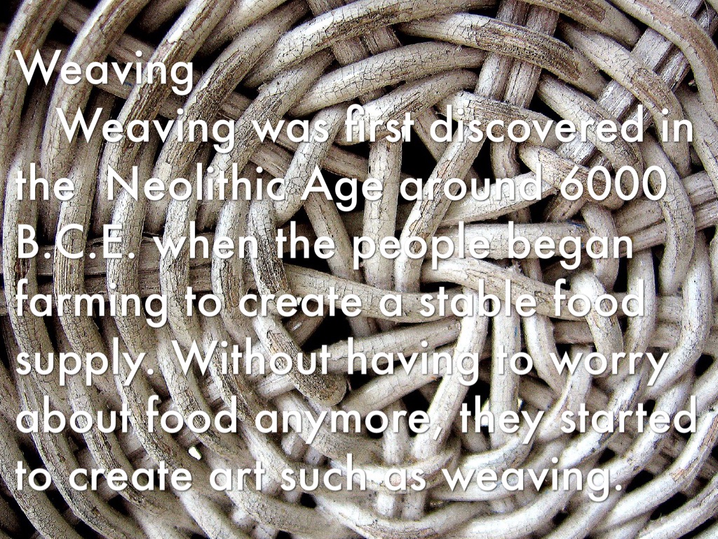 Weaving was first discovered in the Neolithic Age around 6000 B.C.E. when the people began farming to create a stable food supply. Without having to worry about food anymore, they started to create art such as weaving.