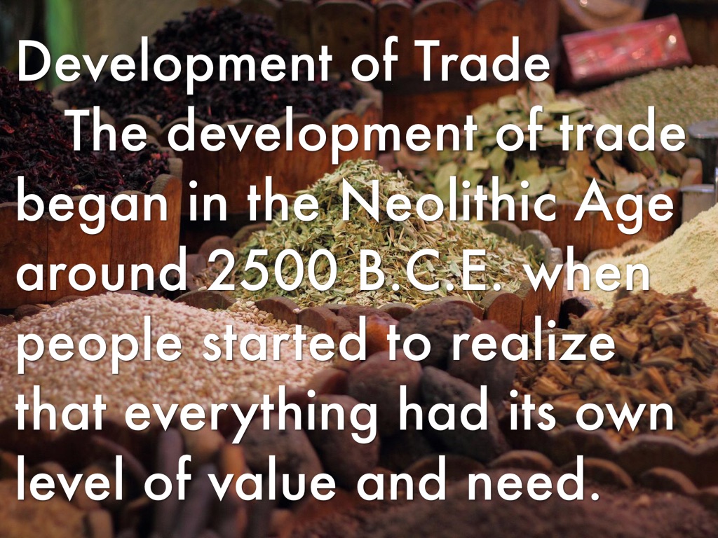 The development of trade began in the Neolithic Age around 2500 B.C.E. when people started to realize that everything had its own level of value and need.