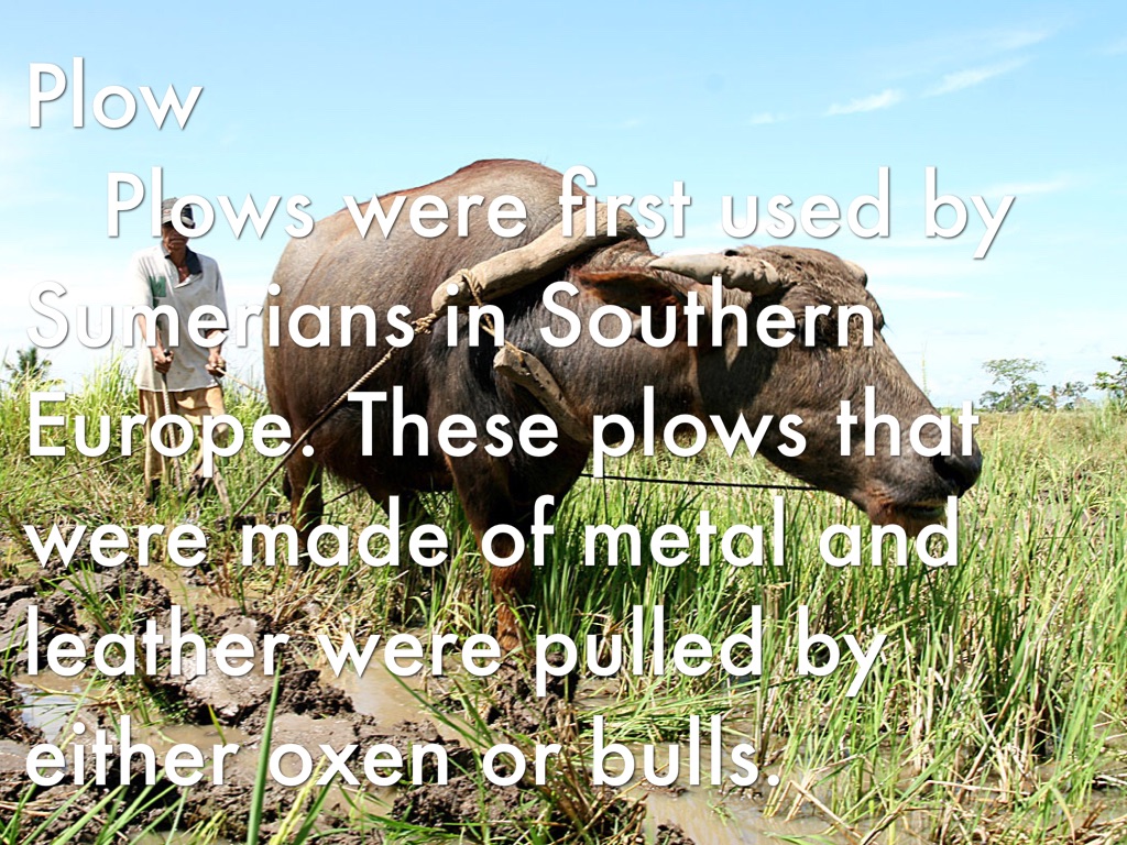 Plows were first used by Sumerians in Southern Europe. These plows that were made of metal and leather were pulled by either oxen or bulls.
