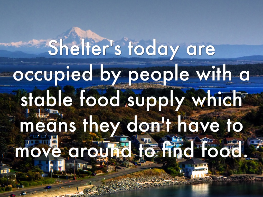Shelter's today are occupied by people with a stable food supply which means they don't have to move around to find food.
