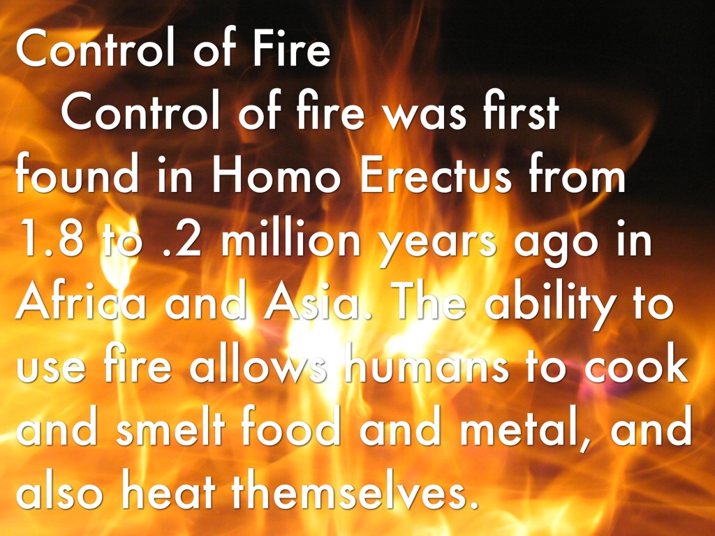 Control of fire was first found in Homo Erectus from 1.8 to .2 million years ago in Africa and Asia. The ability to use fire allows humans to cook and smelt food and metal, and also heat themselves.