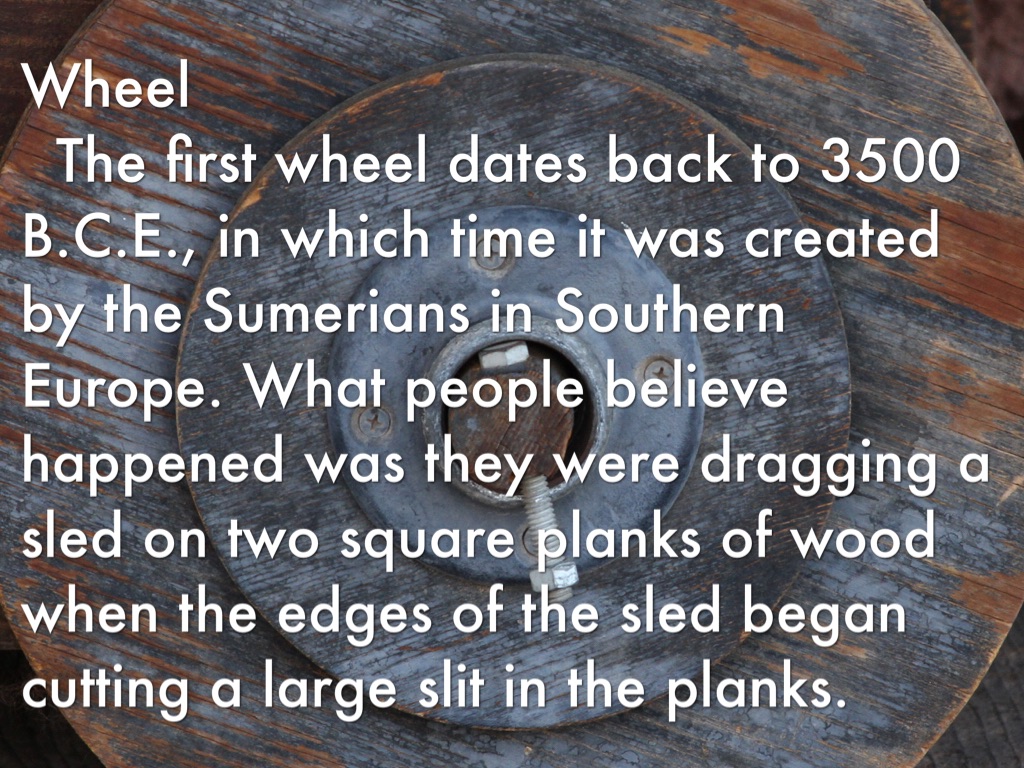 The first wheel dates back to 3500 B.C.E., in which time it was created by the Sumerians in Southern Europe. What people believe happened was they were dragging a sled on two square planks of wood when the edges of the sled began cutting a large slit in the planks.